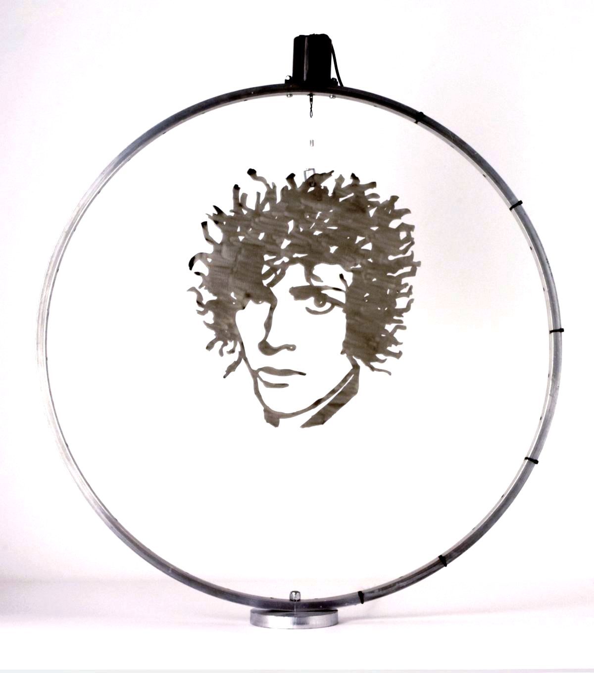 This piece portrays the cheeky, humourous and enigmatic nature of the iconic Syd Barrett at his most creative in the 1960s. His face and shadow appear and reappear by virtue of a spinning motor which gently turns Syd's head within the bicycle wheel - a reference to one of his most famous songs. Using an oil wheel light reminiscent of the early Mike Leonard lightshows enhances the effect even further as shown in movie below.