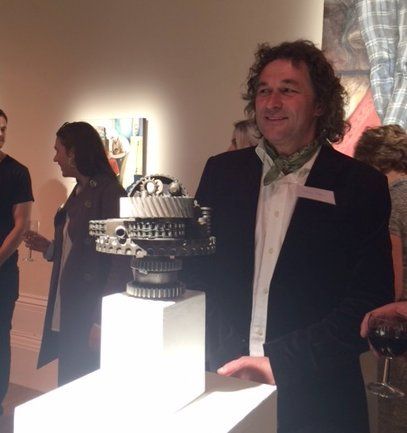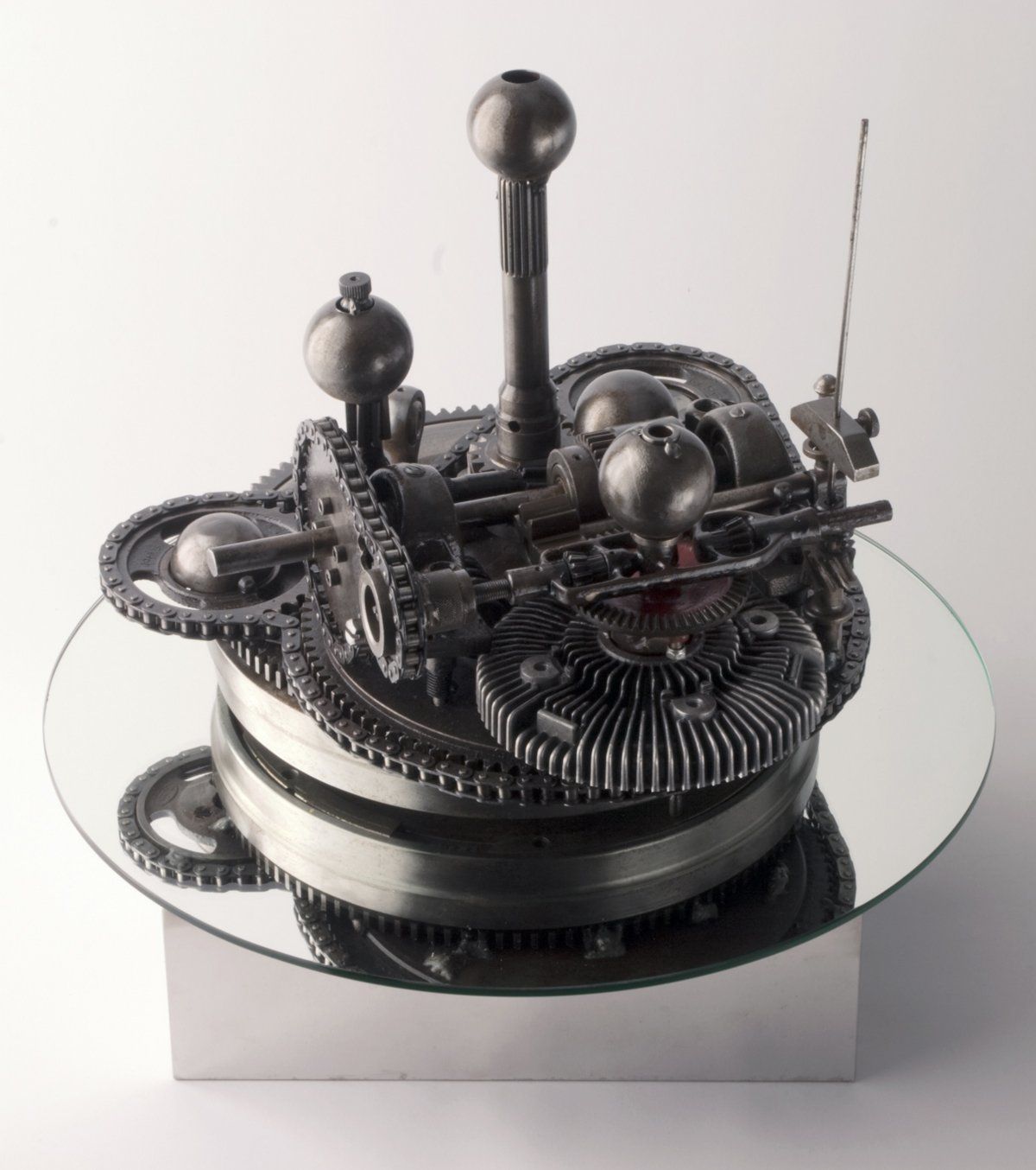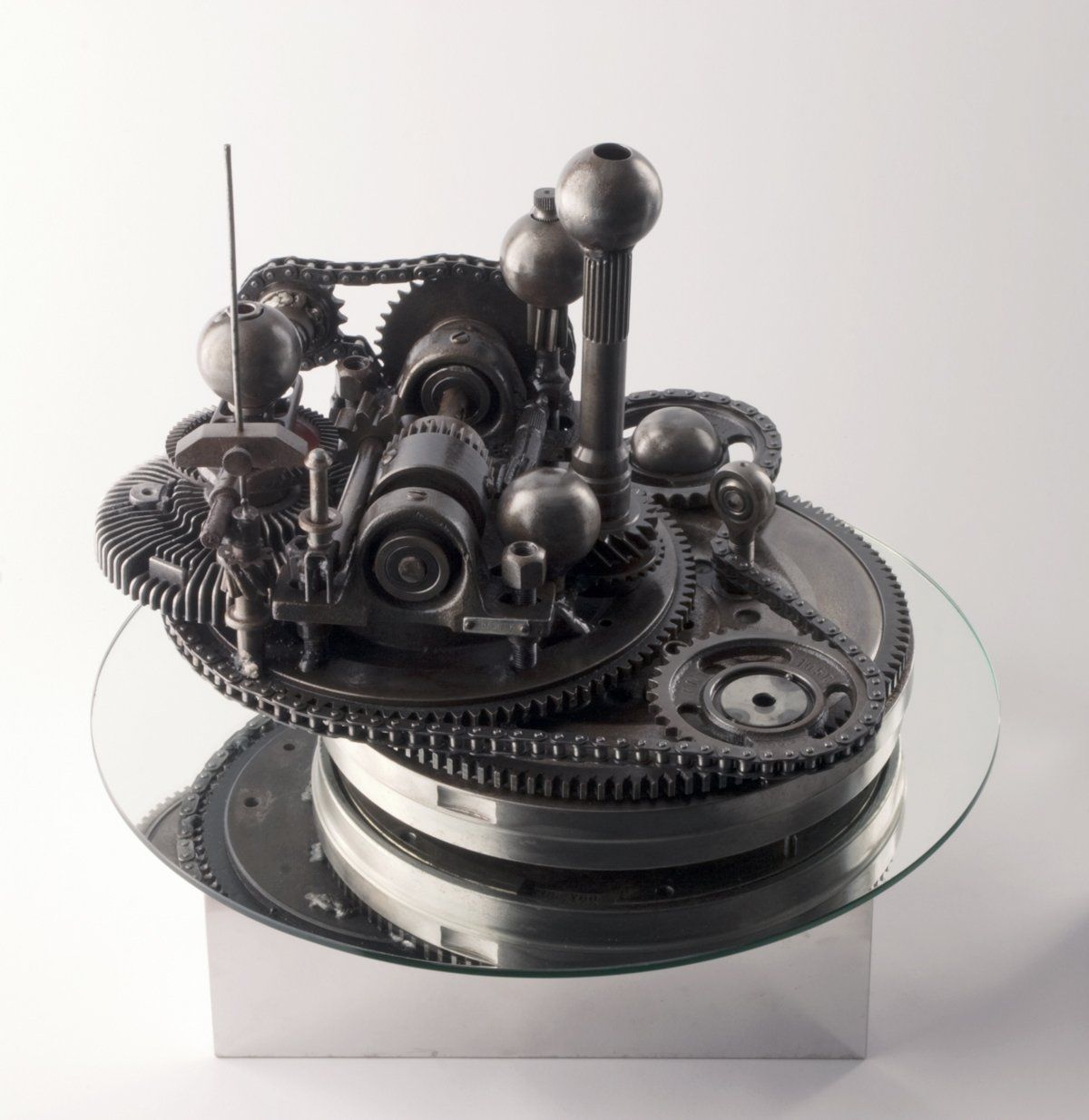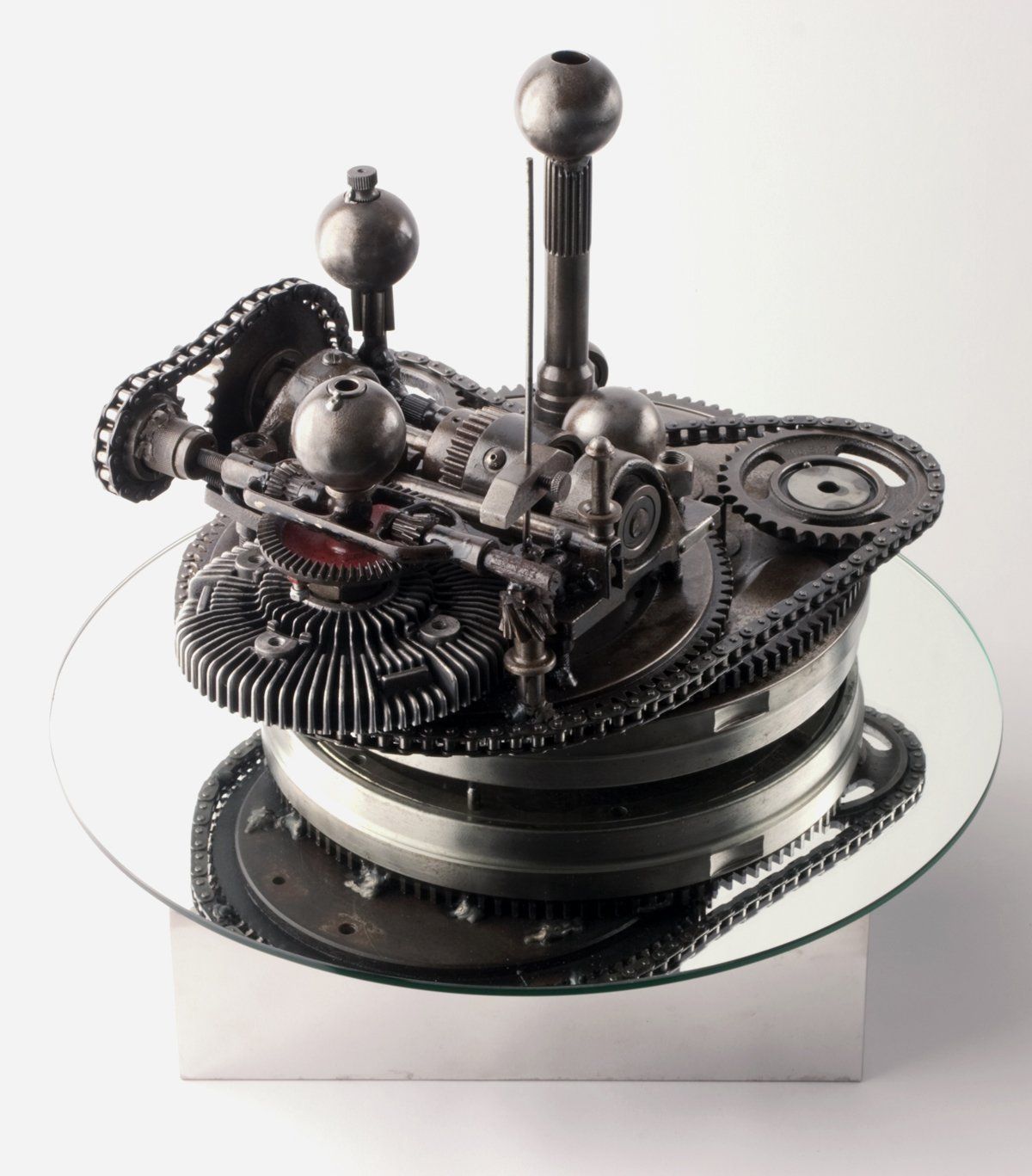 Machin (sic) 2 is a larger, bolder and more detailed expression of the original theme. The use of the mirrored plinth makes for an interesting exploration of the under-workings of the piece. An additional influence that informed this sculpture is the machine drawn by Nick Mason for the cover of an early Pink Floyd album cover.