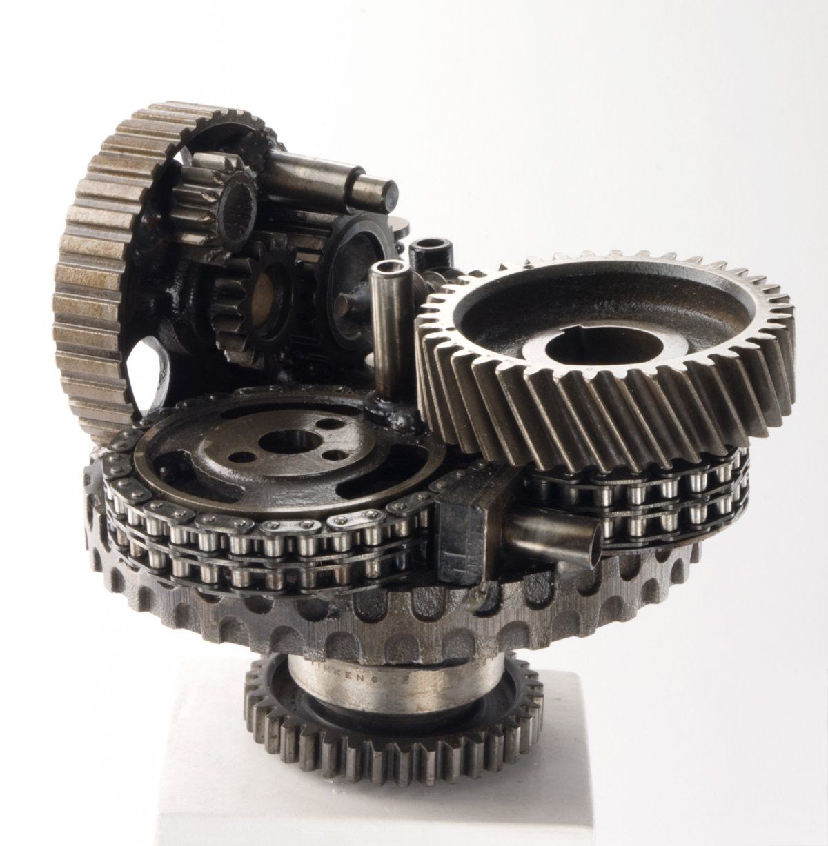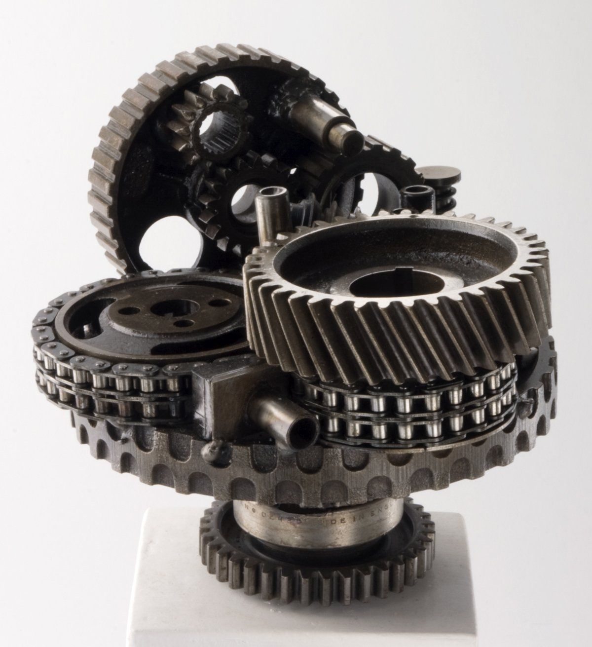 Machin (sic) 1 has been purposely made from many perfectly serviceable, valuable and high specification components. They are brought together as a seemingly impressive mechanical device, mounted on bearings that allow it to be turned, further reinforcing the impression of complexity and effectiveness. Despite the attractive and uniform finish of the components, and impressive form coupled with an initial impression of functionality, the machine is flawed; hence the title. The gears do not mesh. The chain does not engage.