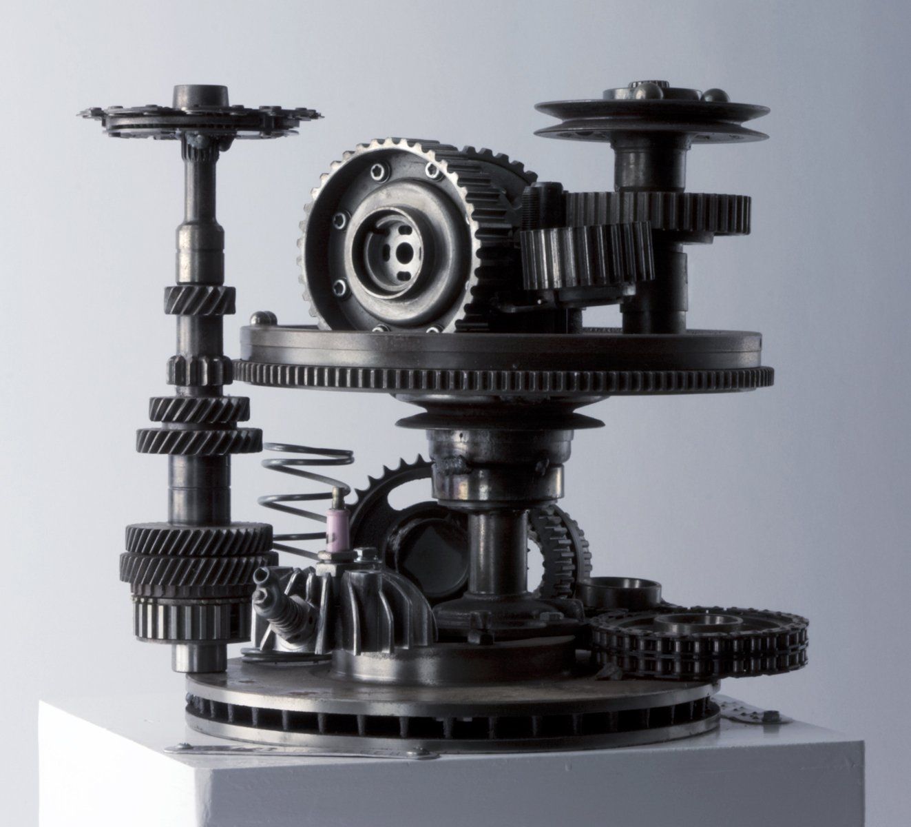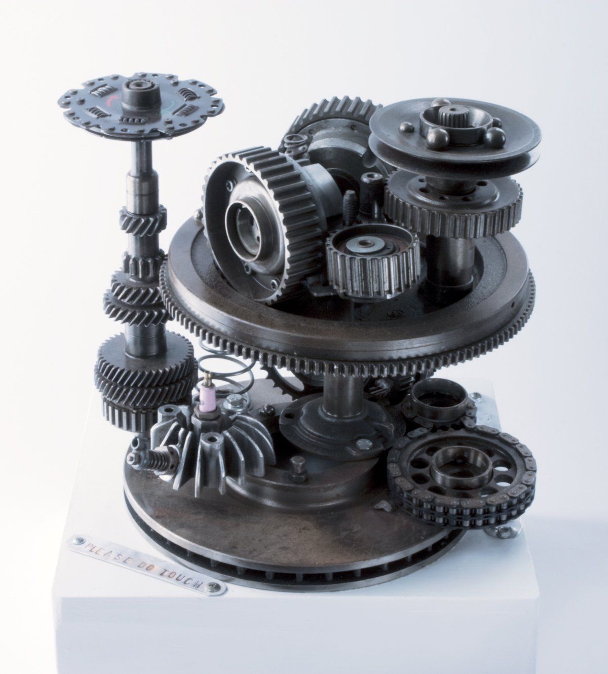 Machin (sic) 3 features gear sets that mesh and move when operated by a green lever but crunch and grind when the red lever is operated. Other useless or dysfunctional but aesthetically pleasing elements are important in this piece also. Spadge was inspired by Man Ray’s transformation of a working object into a non-functional one during his work on this series of sculptures.